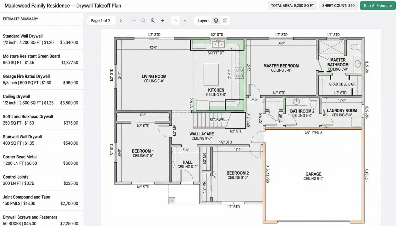 Trained to serve drywall takeoff needs across different sectors, AI Takeoff Software processes complete drawing sets quickly and accurately. The AI reviews project plans and extracts the data needed for clear estimates. This helps teams prepare bids confidently for projects in any sector.