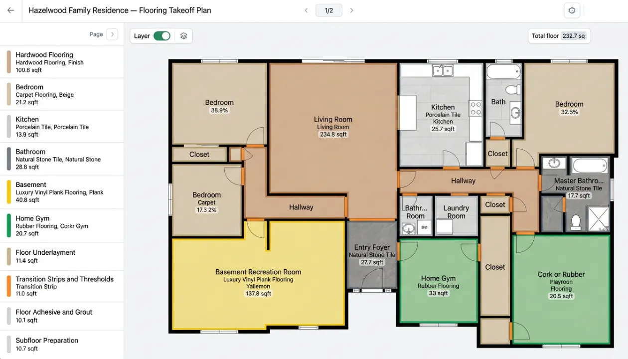 Automated flooring software helps contractors generate accurate flooring quantities for homes, apartments, and residential developments. The platform analyzes plans and calculates materials for every room quickly and precisely. This allows residential contractors to prepare faster estimates and manage projects more efficiently.